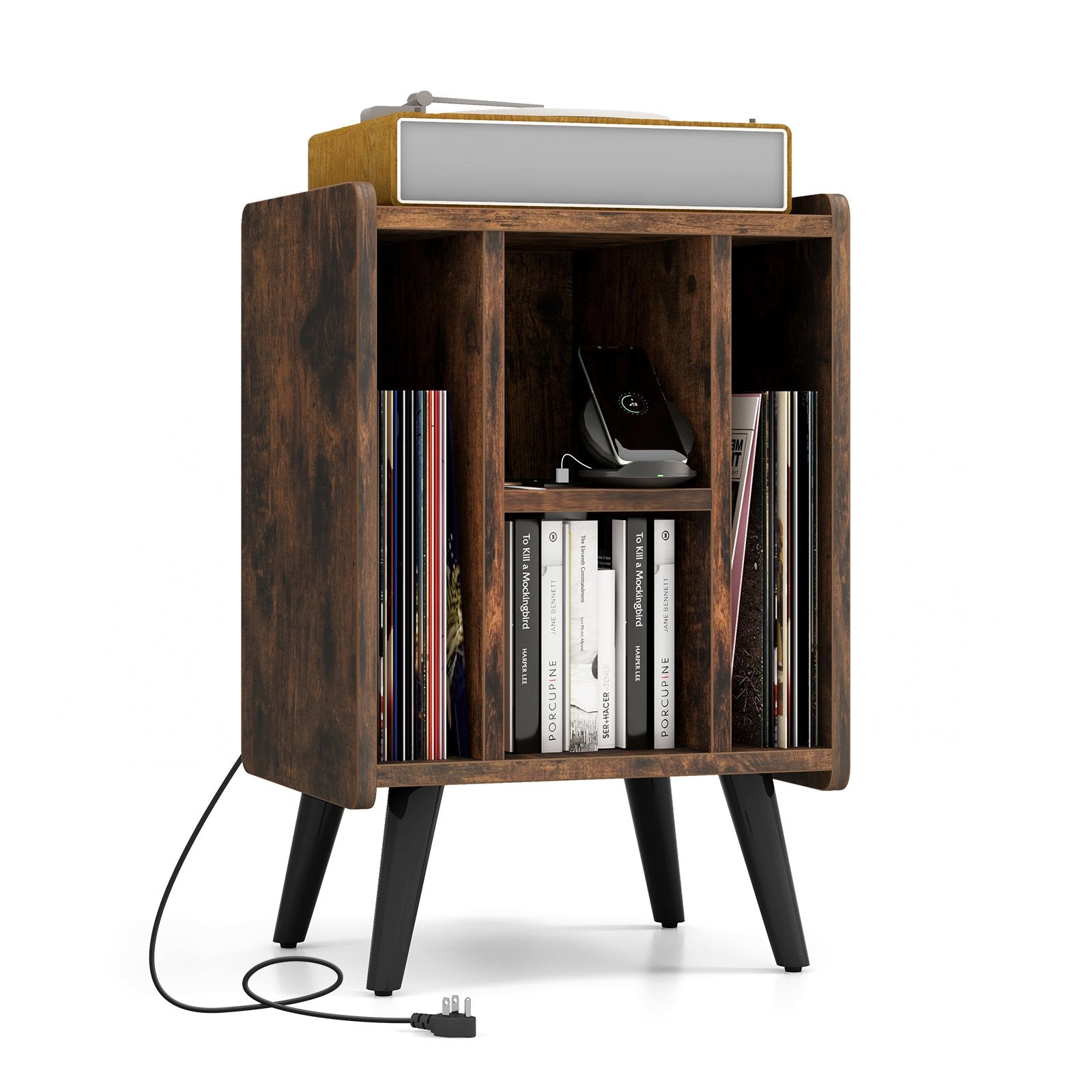 ● Built-in Charging Station: Featuring 2 power outlets 2 USB and 1 Type-c charging ports this record player stand allows you to flexibly charge a record player turntable phone headset or tablet. Meanwhile the circular wire holes on the back panel and the top wire hole cover make connecting music devices convenient.