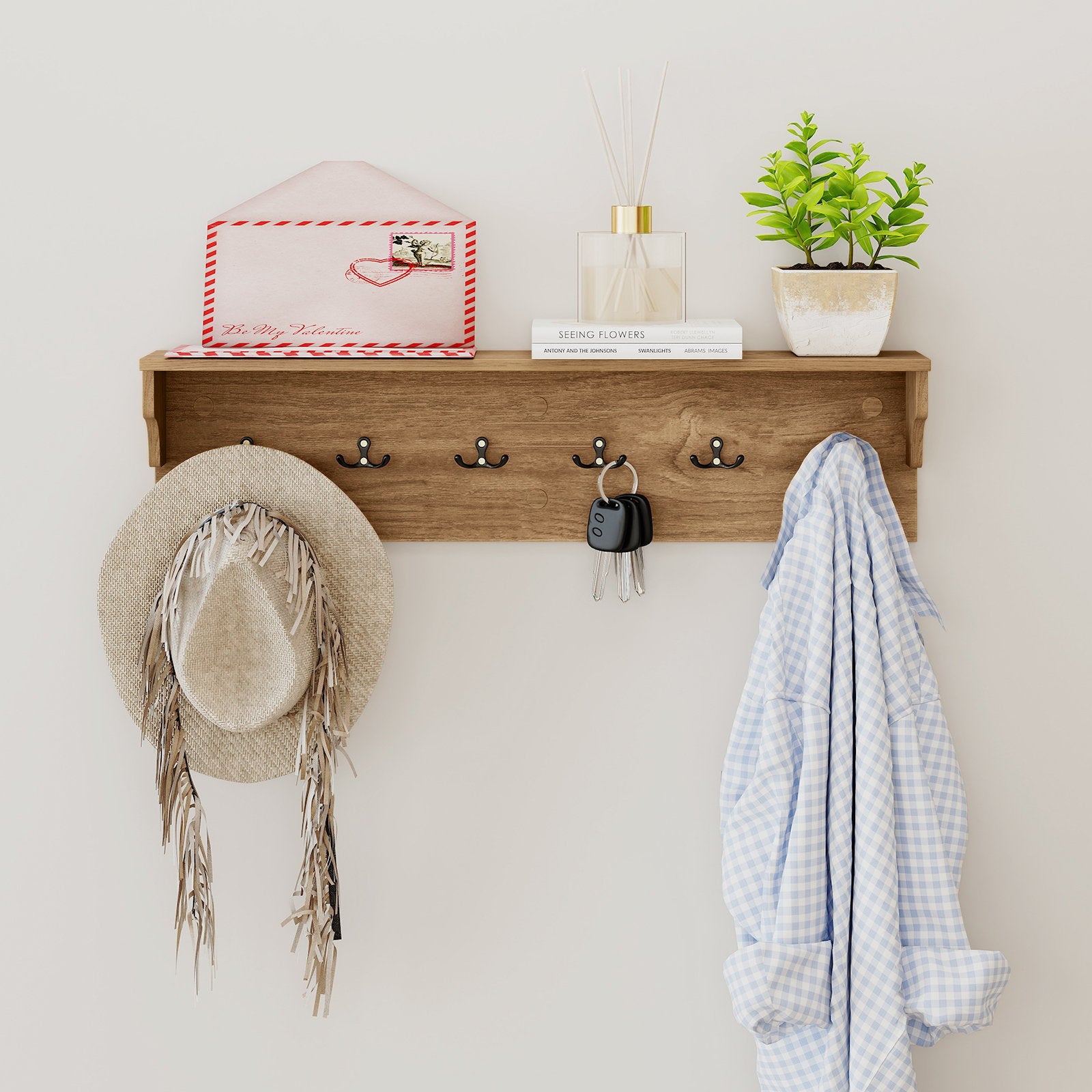 ● Built for Stable Use: Constructed with a robust wooden frame this wall hooks with shelf exudes durability and dependability. The solid structure supports your belongings securely providing peace of mind.