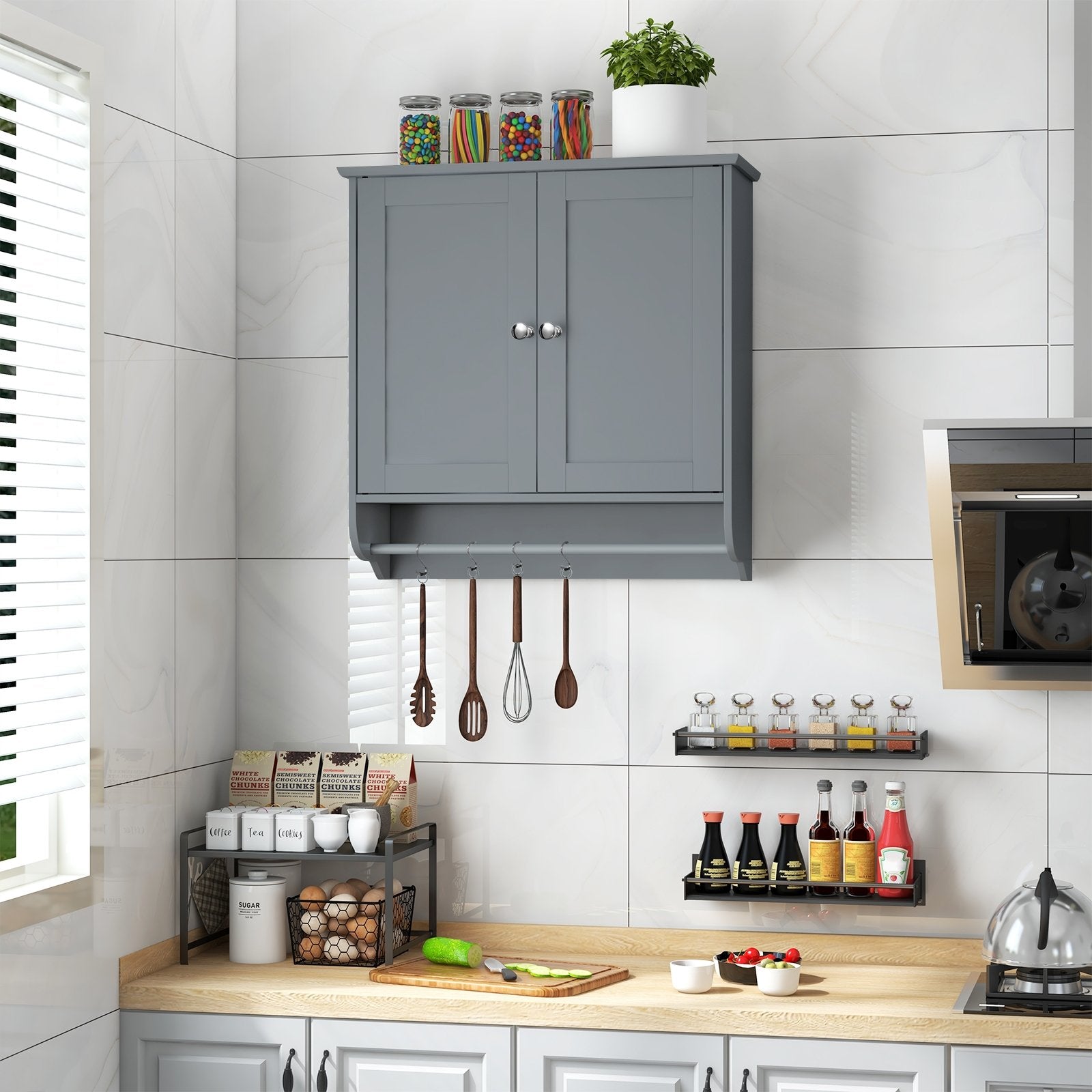 ● Multifunctional Wall Cupboard: There is a 3-level adjustable shelf inside this cabinet. You can adjust its height freely to meet your storage needs. And a practical towel bar can be used to hang towels ties belts and so on keeping them clean dry and well organized.