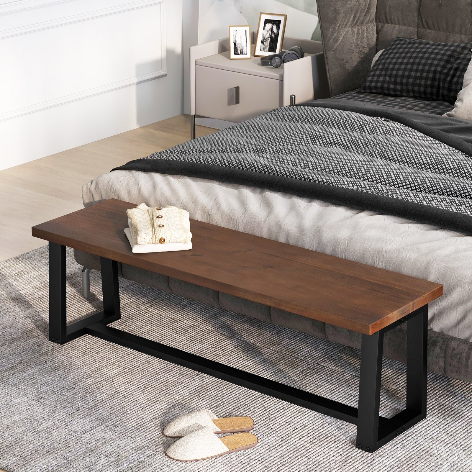 Wood Dining Bench with Metal Frame and Adjustable Footpads-Black