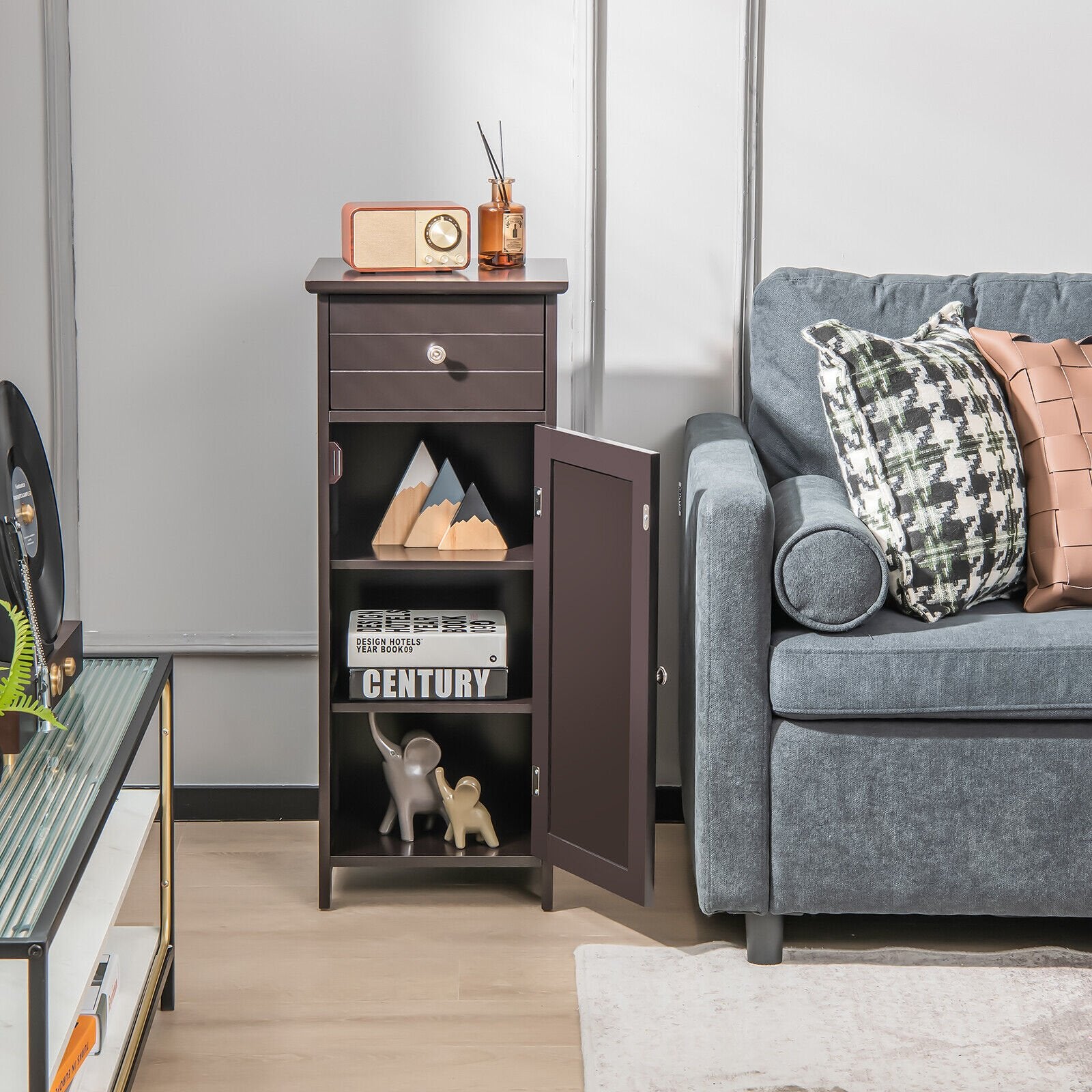 ● Ample Storage Space: Designed with an idea of flexible storage space the cabinet with a large drawer can provide ample storage space for multiple items. In addition the top allows you to display decorative plants or put something for easy access.