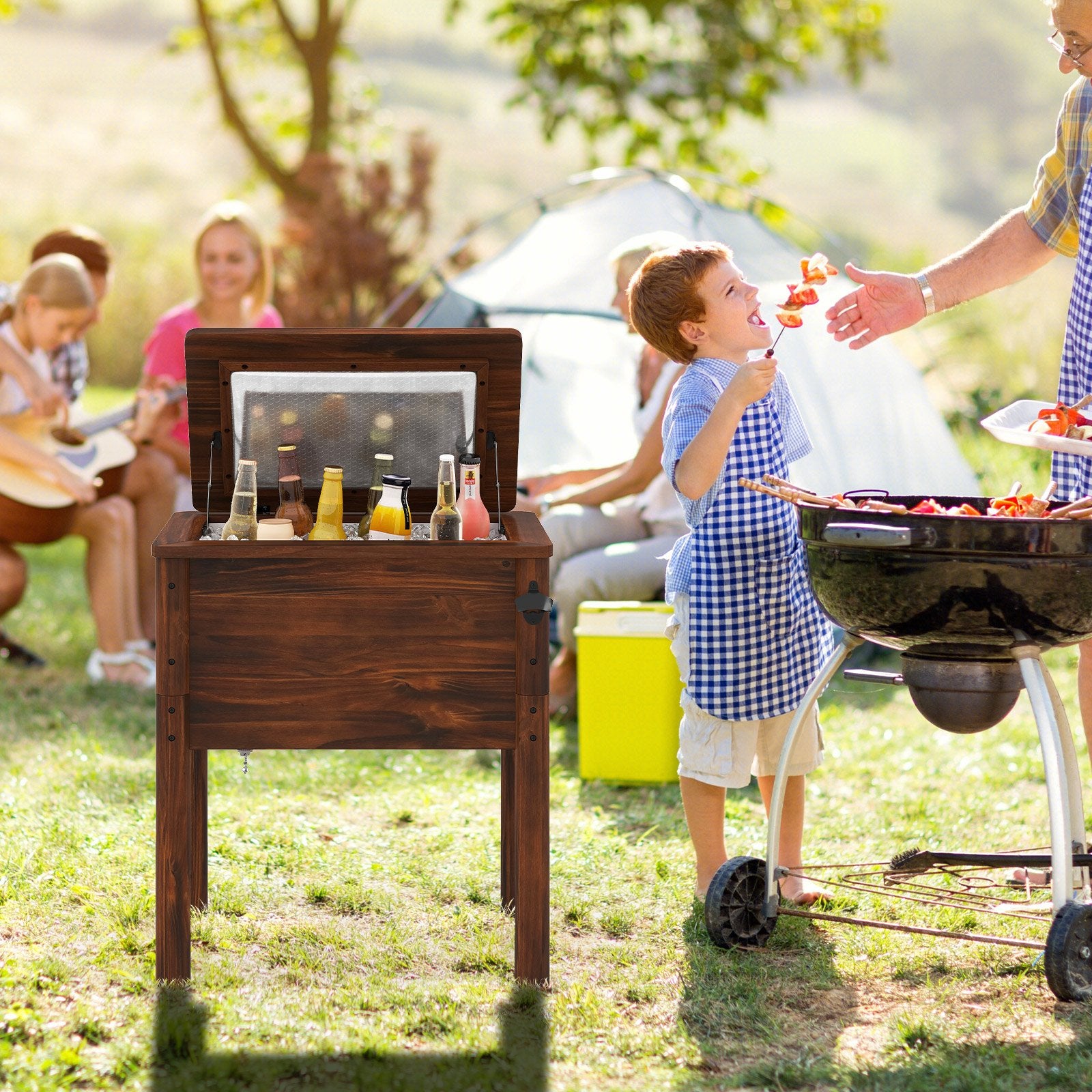 Wooden Patio Cooler with 3 Handles and Bottle Opener-Brown