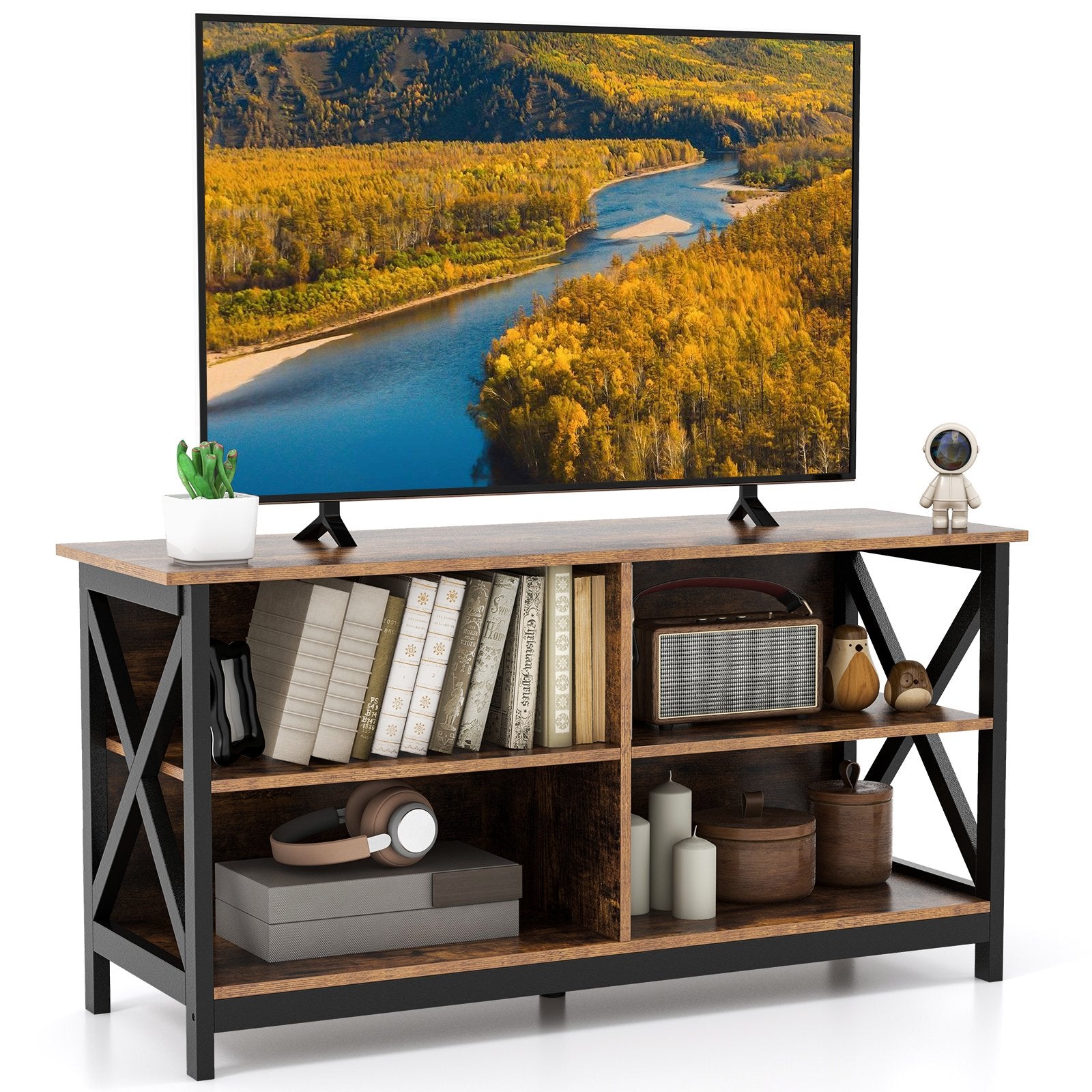 - Large Storage Space: This TV stand is the perfect home storage solution. The tabletop is spacious enough to accommodate TVs up to 55”. Four open compartments allow you to access items without obstacles while providing enough storage and display space for books DVD players game consoles and other items.