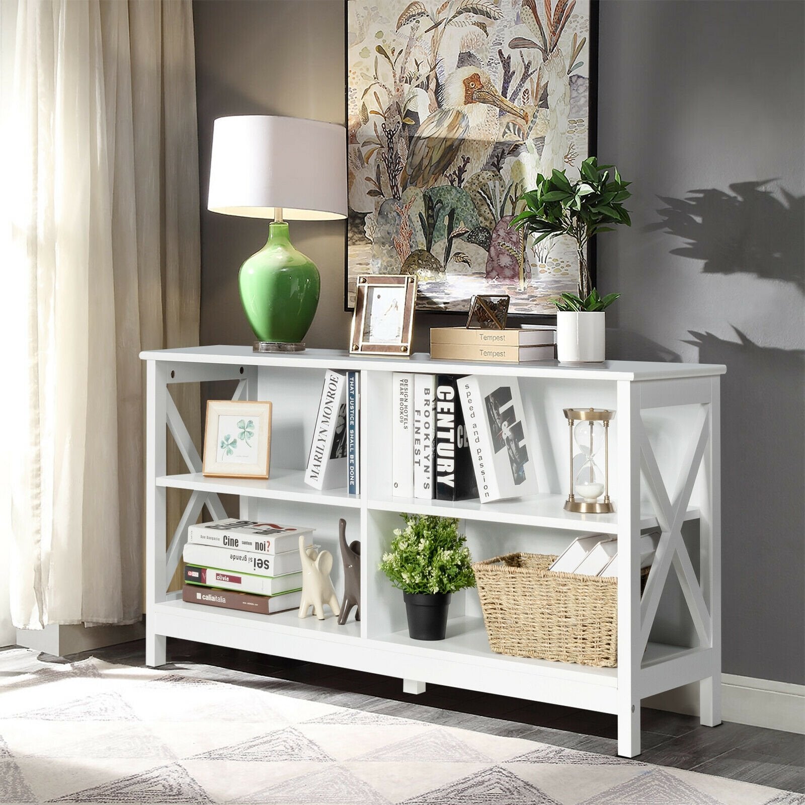 - Large tabletop to place a 55" TV plants photo frame and more
